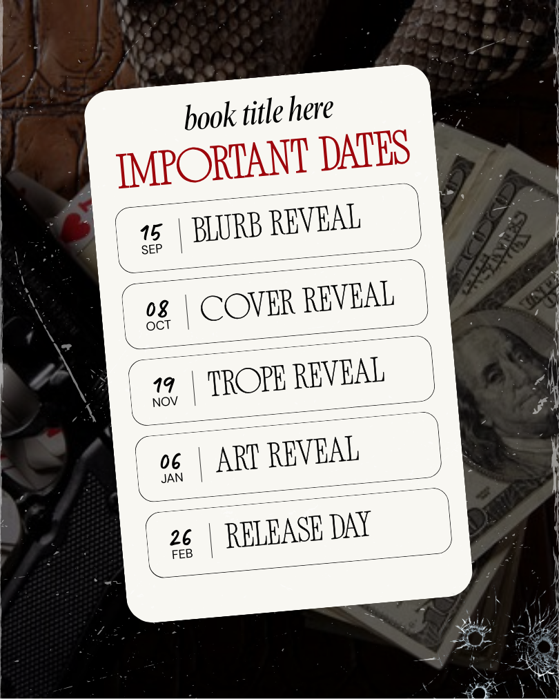 Keywords: dark romance, mafia, dates, reveal, events, signings, calendar, timeline